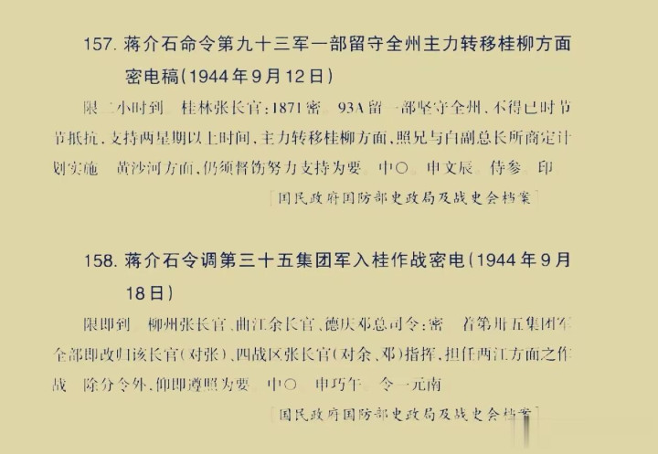 电报原文如下:“限二小时到,桂林张长官,93军留一部坚守全州,不得已时节节抵抗,支持两星期以上时间,主力转移桂柳方面,照兄与白副总长商定计划实施,黄沙河方面,仍须督饬努力支持为要”。